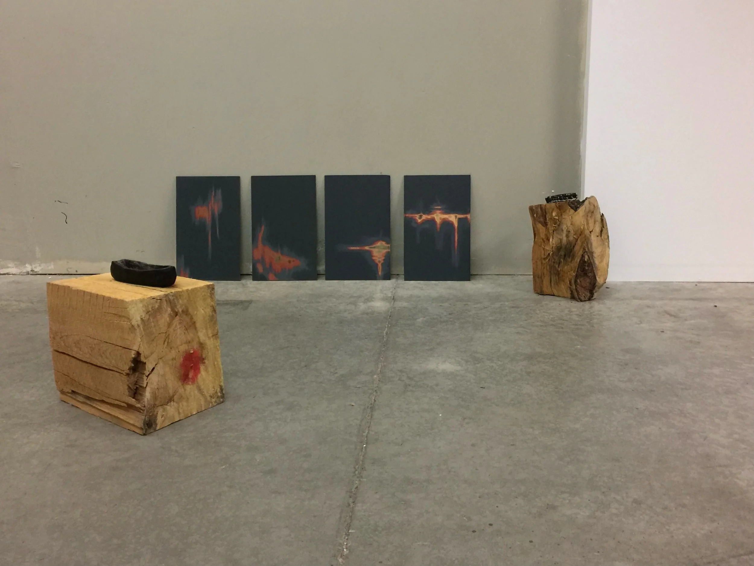 Installation view, based on the Iliad by Homer: Catalogue of Ships. 34 boats made of clay and scratched mirrors. exhibited at 5.point Gallery Santa Fe NM in 2018. “and in HER Command sailed 34 black boats.”